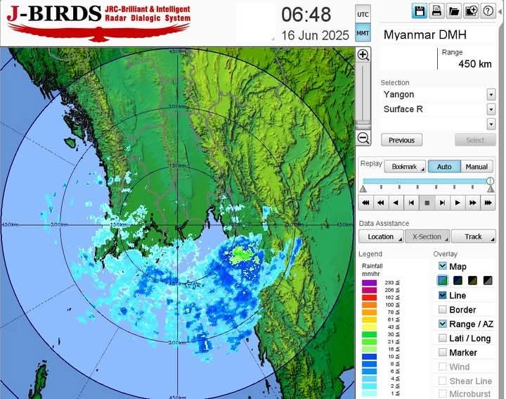 ヤンゴン管区、サガイン管区北部、エーヤワディ管区、カチン州、チン州、モン州、ラカイン州、シャン州(北部・東部)で雷雲が発達しており、これらの雷雲が移動する経路沿いでは、降雨とともに強風、雷雨、落雷、稲妻、雹などの気象現象が発生する可能性があるため、事前に注意するよう勧告いたします。